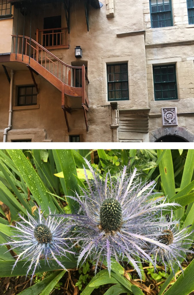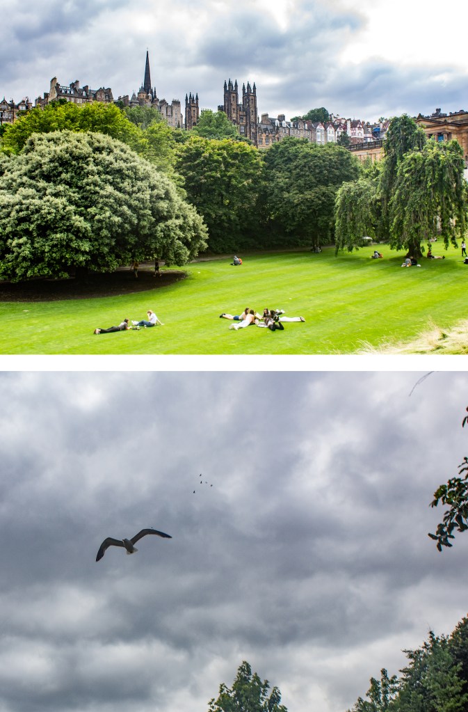 Scendiamo la scala e ci immergiamo nel verde dei giardini, passeggiando sul vialetto e immortalando la bellezza lussureggiante degli alberi sopra i quali spuntano le scure sommità dei palazzi della Old Town.