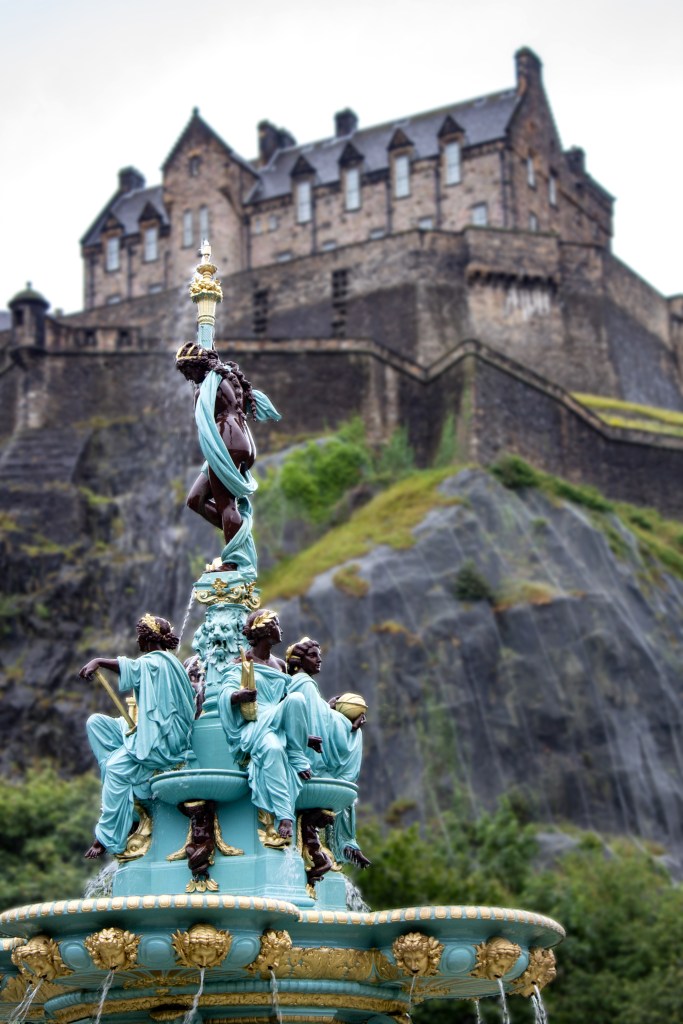 Eccoci ora davanti alla Ross Fountain: devono averla restaurata in questi ultimi anni perché la prima volta che siamo venuti, nel 2015, era tutta dello stesso colore (simil ottone), mentre ora è un tripudio di turchese, marrone e oro.